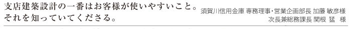 私どもの意向をしっかり汲んで頂き、制度上必要なものも事前に教えて下さり素人には安心です。また、その都度、相談もして下さり内容も非常に分かりやすい。まあっ、あ・うんの呼吸というのでしょうか!支店建築設計の一番はお客様が使いやすい事です。それを知っていてくださる。